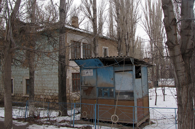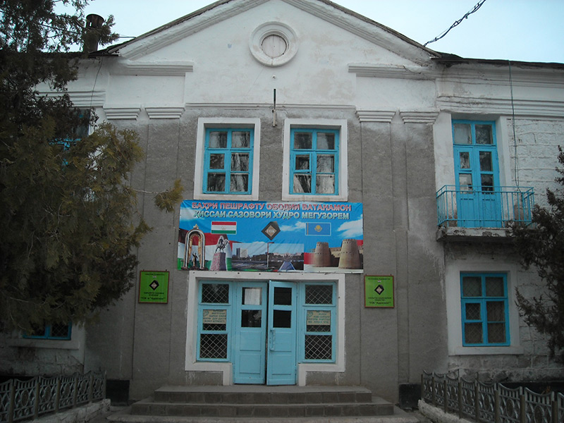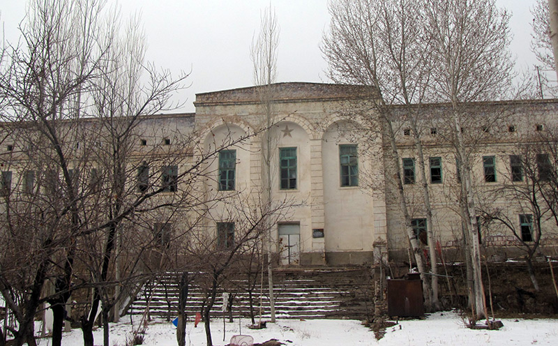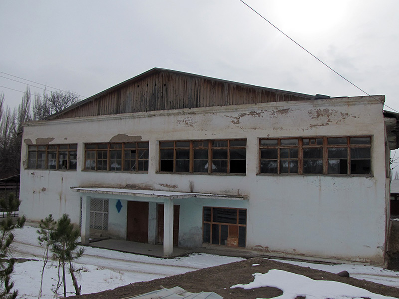Отправляюсь обходить поселок. Первым на моем пути оказывается здешний Дворец культуры. Его судьбу по сравнению с другими зданиями можно считать завидной — в прошлом году он подвергся капитальному ремонту. А вот стадион, расположенный метрах в трехстах от Дворца, явно этого самого ремонта требует. Далее на холме находится общеобразовательная школа №5 имени Садриддина Айни. Раньше школа носила имя Владимира Маяковского — до обретения республикой независимости школа считалась русской. После отъезда русскоязычных жителей преподавание в ней стало вестись на государственном языке.