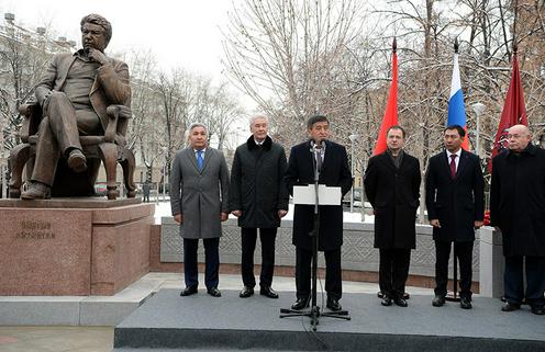 Болот Отунбаев (крайний слева) на открытии памятника Чингизу Айтматову в Москве. Фото предоставлено посольством Киргизии в России
