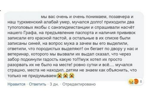 Впрочем, это не главное. Главное — многочисленные свидетельства самаркандцев, которые в эти дни потеряли своих питомцев. Начиная с женщины, на доме которой установлены камеры. По ее словам, в тот же день, 29 августа, после нескольких часов мучений умерла ее собственная собака. А позднее, 2 сентября, скончалась еще и кошка. Другой самаркандец рассказал, что «прививочная бригада» записала его алабая в тетрадь красной ручкой, хотя другие собаки были записаны синей. Визитеры пояснили, что красным помечают породистых животных. А вскоре собаке стало плохо. Вызванный хозяевами ветеринар сразу предположил, что через забор во двор подкинули яд. Спасти животное врач оказался не в силах.