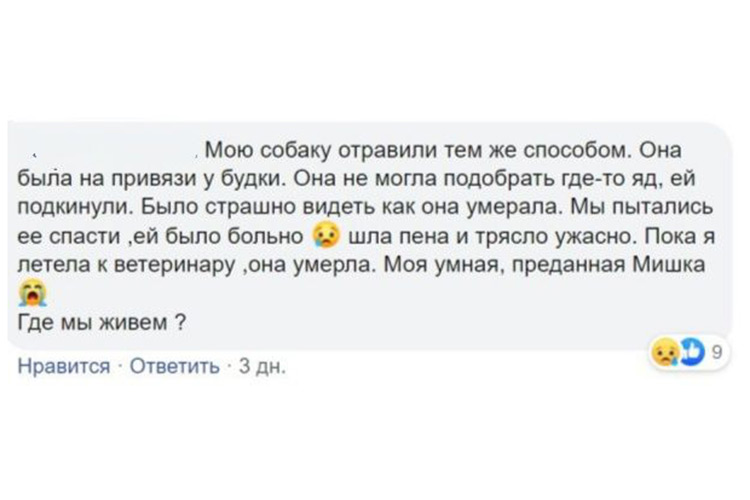 Третья жительница города свидетельствует, что от подкинутого через забор яда погибла и ее собака, и собаки нескольких соседей. «Она бегала кругами и кричала. Оказывается, в этот момент у нее случилось внутреннее кровотечение от моментального разрушения внутренних органов. Всех. Боль, которую испытывает животное в этот момент, не описать», — жалуется женщина. Она подчеркивает: «Убили здоровую, счастливую, любимую и любящую собаку. В своем же доме!»
