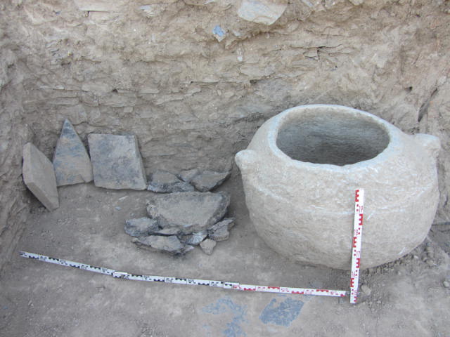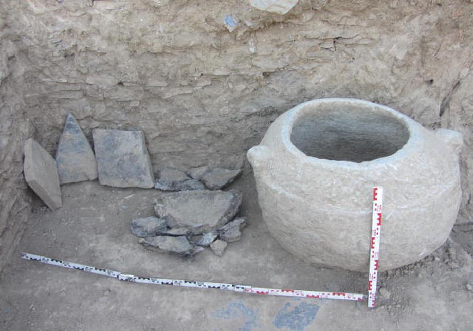 В цитадели мы нашли помещение, в восточной стене которого был обнаружен алтарь, — он свидетельствует о том, что здесь был домашний храм или, точнее, царское святилище. Там был обнаружен огромный каменный сосуд весом не менее двух тонн, высеченный целиком из камня, который и сейчас пригоден для применения. Неподалеку оказалась массивная голубоватая шлифованная плита и большое блюдо. Скорее всего, в этом сосуде хранили хаум — напиток из воды с соком растений, который освежает память и полезен для здоровья, а блюдо предназначалось для хлеба. Несомненно, что в святилище возносились молитвы, а перед ними зороастрийцы принимали хаум и кусочек хлеба, что придавало ясность уму при чтении молитв», — поясняет ученый.