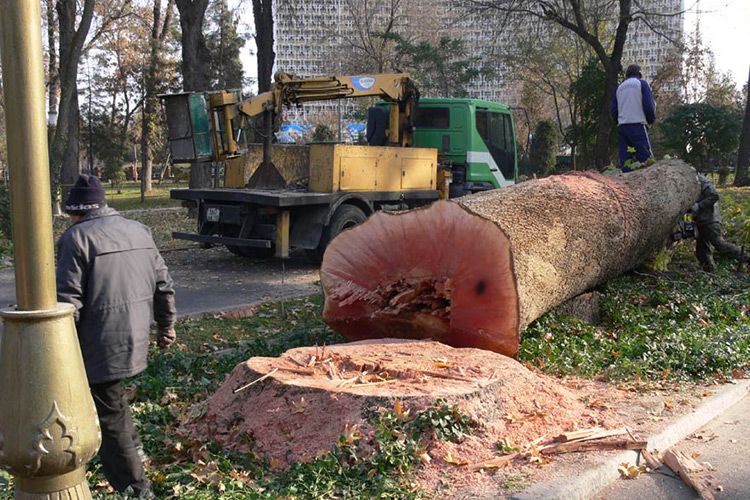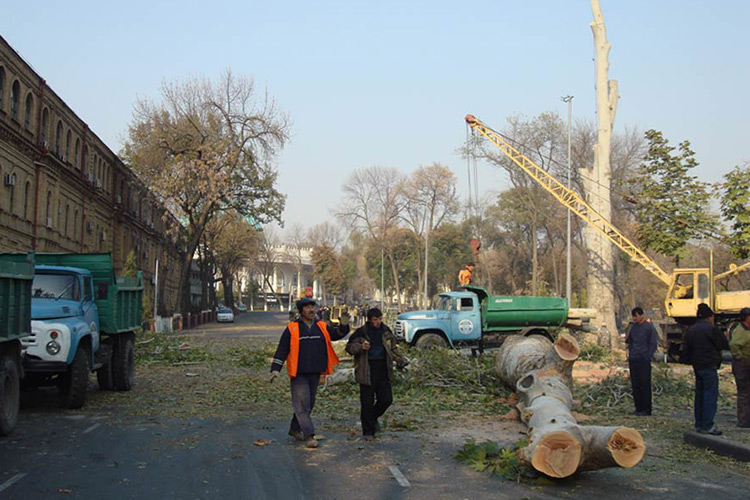 Примечательно, что указ президента республики Шавката Мирзиёева, предусматривающий запрет на уничтожение деревьев, был издан спустя ровно десять лет после того, как в центре Ташкента у всех на глазах произошло массовое убийство. Вооруженные топорами и бензопилами наемники под аккомпанемент ценных указаний чиновников и, как выяснилось позже, по приказу главнокомандующего (тогдашнего руководителя страны Ислама Каримова) вырубили вековые чинары в сквере Амира Темура. Столица потеряла часть своей истории, а ее жители – возможность прогуливаться в тени зеленолистных исполинов. Кто же знал, что это было только начало завоевательного похода лесорубов. Ташкентская «резня бензопилой» распространилась по всей стране. Некогда славные своими зелеными насаждениями Фергана, Бухара, Самарканд с годами стали все больше напоминать пустыню.