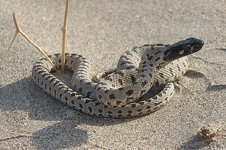 Дети аплодируют, затем плотно обступают меня и начинают щупать змею. Объясняю им, что это не гюрза. При такой длине (около метра), гюрза была бы толщиной 4-5 см, а эта змея около 2,5 см в самом толстом месте. Потом, как все знают, у гюрзы на сером фоне с темными полосками и пятнами есть яркие оранжевые пятнышки, а у полоза — нет. Это разноцветный полоз, имеющий характерные признаки: по бокам головы у него две полоски, одна — от глаза к углу рта, другая — от глаза к середине рта.