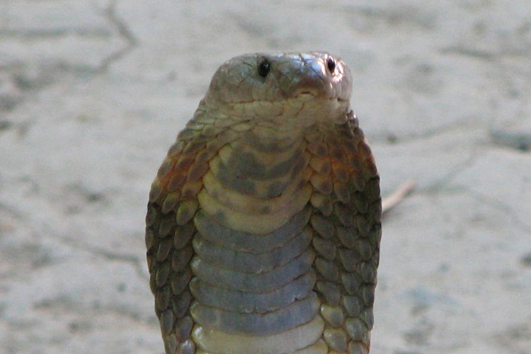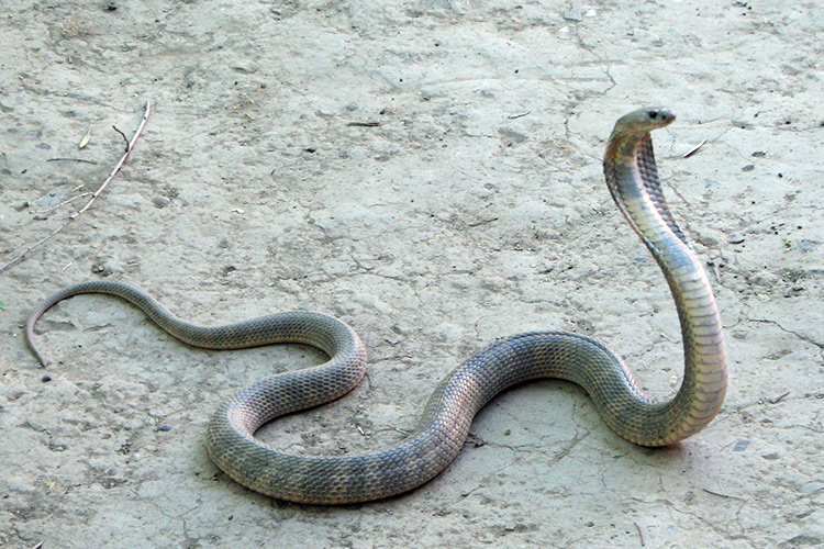 Делаю обход территории лагеря, начиная от входных ворот и далее вверх по течению сая. В средней части лагеря есть оранжевый горбатый мостик. Перехожу его, иду вдоль воды, внимательно глядя по сторонам. Под невысоким глиняным обрывом взгляд натыкается на крупную кобру, с темной, почти черной спиной. Лежит неподвижно, слегка подняв голову и раздув шею, но убежать не пытается и даже не шипит. Подарок судьбы: наконец-то попалась змея, и не просто змея, а королева змей — кобра.