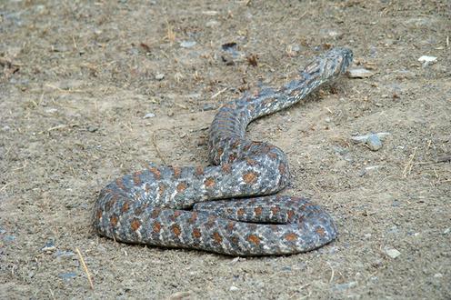 Еще до обеда появляются двое вожатых: дети обнаружили змею. Хватаю инструменты, бегу. На главной площадке лагеря, где проходят пионерские линейки, на невысокой зеленой елочке отдыхает гюрза. Небольшая, около 60 сантиметров длиной, и очень красивая: асфальтово-серая с темными пятнами и полосками, а между ними — вкрапления оранжевых пятнышек. В середине туловища вздутие, явно только что проглотила кого-то размером не меньше воробья.
