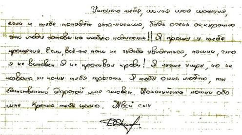 Письмо Дмитрия Чикунова матери. «Умоляю тебя, милая моя мамуля, если к тебе попадет это письмо, будь очень аккуратной: эти люди готовы на любую подлость! Я прошу у тебя прощения, если все-таки нам не судьба увидеться, помни, что я невиновен, я не проливал кровь! Я тебя очень люблю, ты единственный дорогой мне человек. Пожалуйста, помни обо мне. Крепко тебя целую, твой сын»