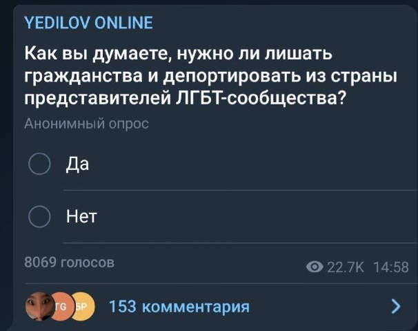 В Казахстане сложно представить себе подобные заявление от политиков, тем более, в местном УК нет такой статьи. Тем не менее, мимо скандала с Feminita не смог пройти внештатный советник президента Ербол Едилов. В своем Telegram-канале он опубликовал опрос, о том, стоит ли лишать гражданства и депортировать из страны представителей ЛГБТ-сообщества.
