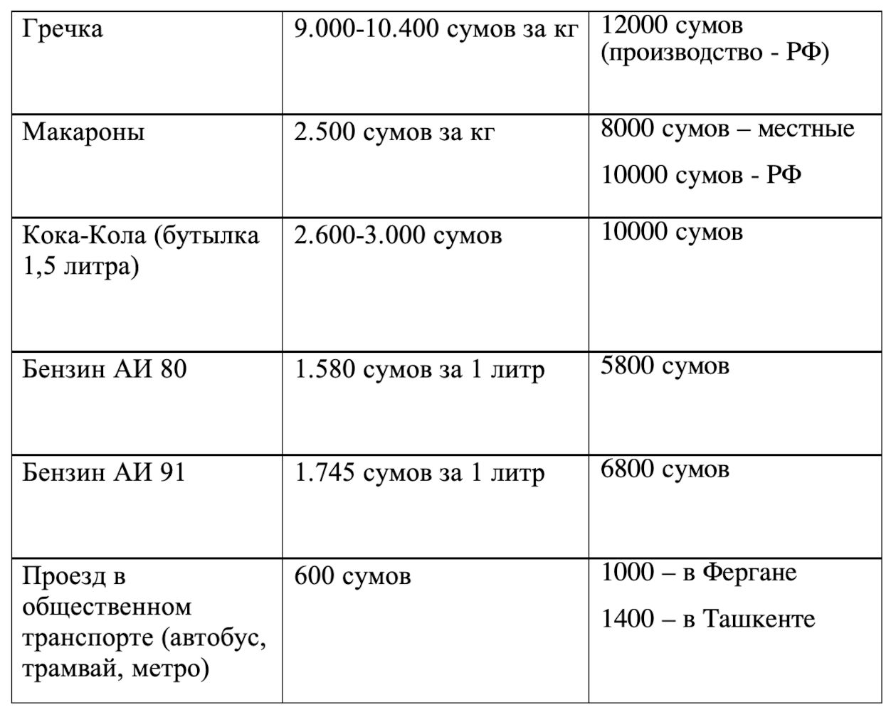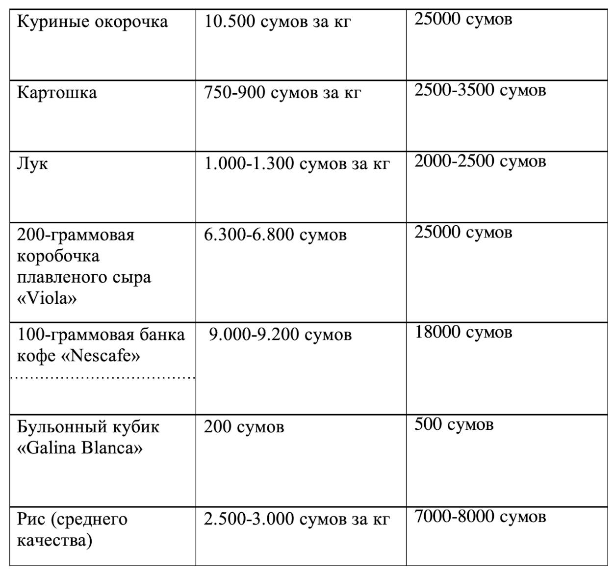 Соответственно, за десять минувших лет сум по отношению к доллару США обесценился более чем в четыре раза. Отметим, что цены на большинство отмеченных в таблице товаров и услуг в такой пропорции не выросли.