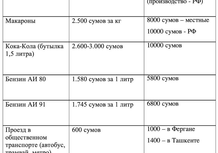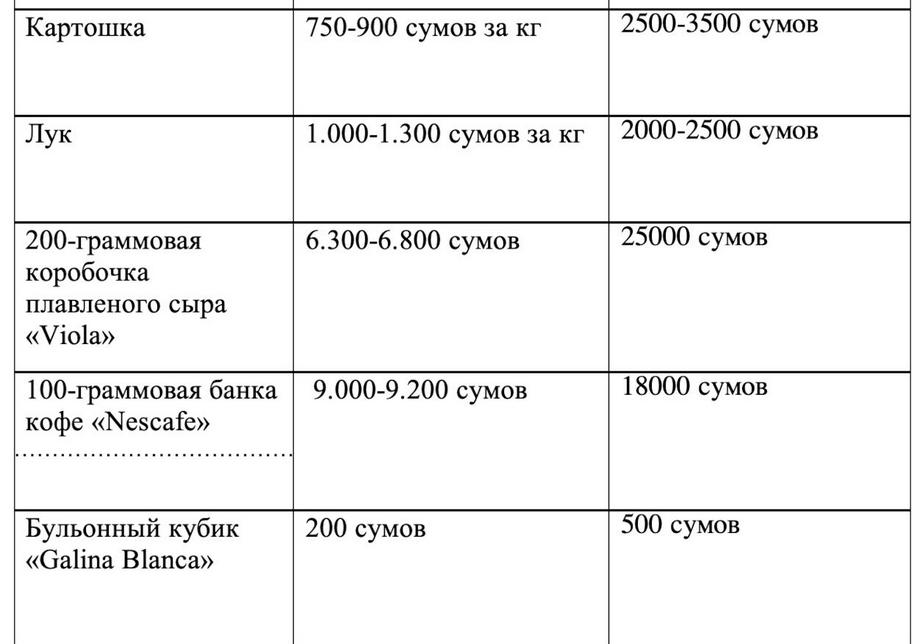 Однако нас с вами интересует сравнение тогдашних цен с сегодняшними. Мы попросили наших корреспондентов пробежаться по базарам и магазинам Ташкента и Ферганы, чтобы зафиксировать цены по состоянию на начало августа 2021-го.