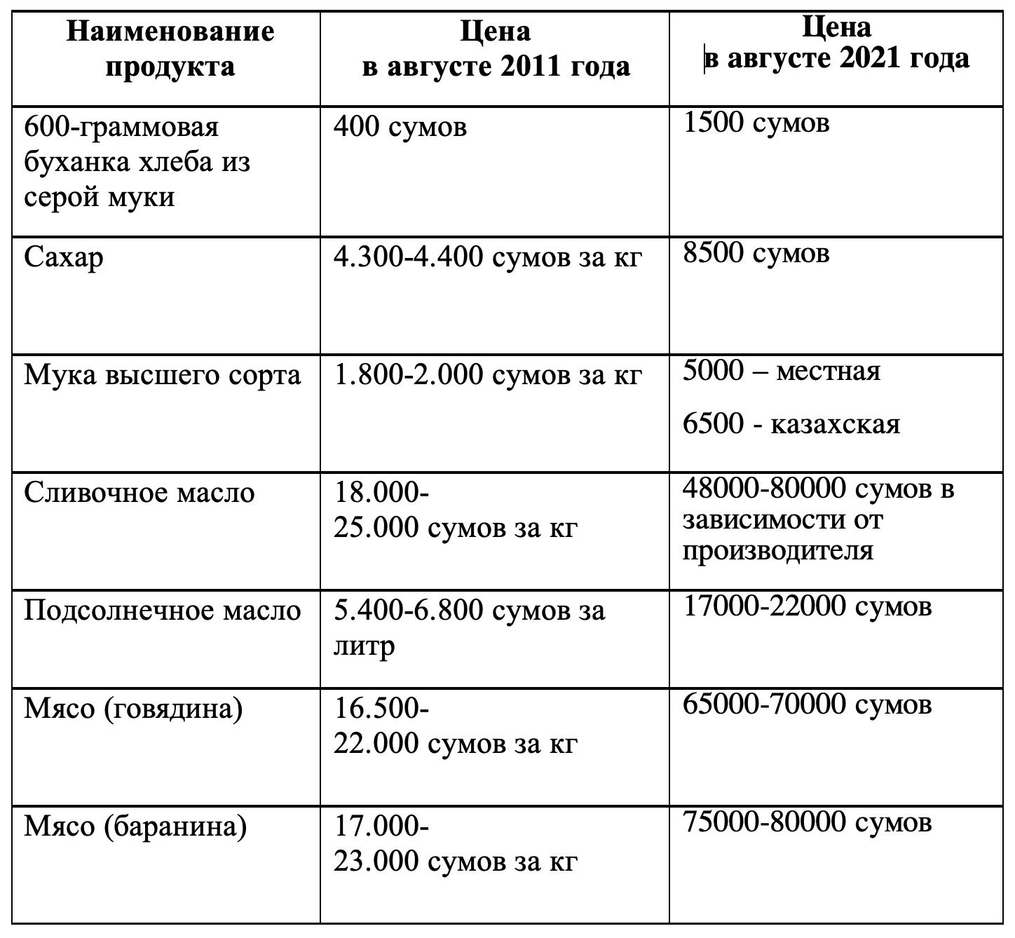 Для того, чтобы вспомнить, сколько стоили картошка и лук, рис и гречка, мясо и макароны ровно десять лет назад, обратимся 👉 к публикации «Ферганы» от августа 2011 года. Статья сопровождается 👉 сравнительной таблицей, демонстрирующей изменение стоимости основных продуктов питания и потребительских услуг в течение одного полугодия.