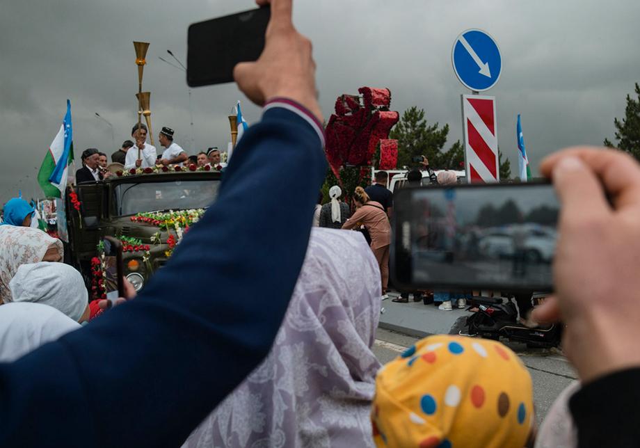 В начале колонны три музыканта в расписных национальных чапанах с сурнаем и двумя карнаями. Здесь же ревет-разогревается эскорт мотоциклистов с национальными флагами.