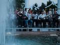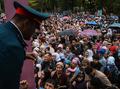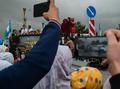 Вокруг — дети, женщины с колясками, мужчины, много прессы, камер и штативов.