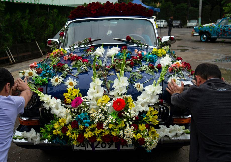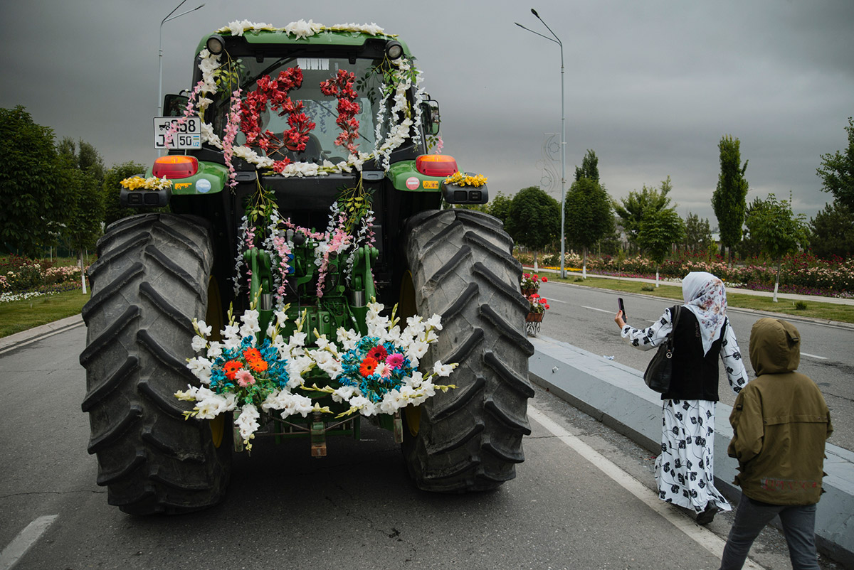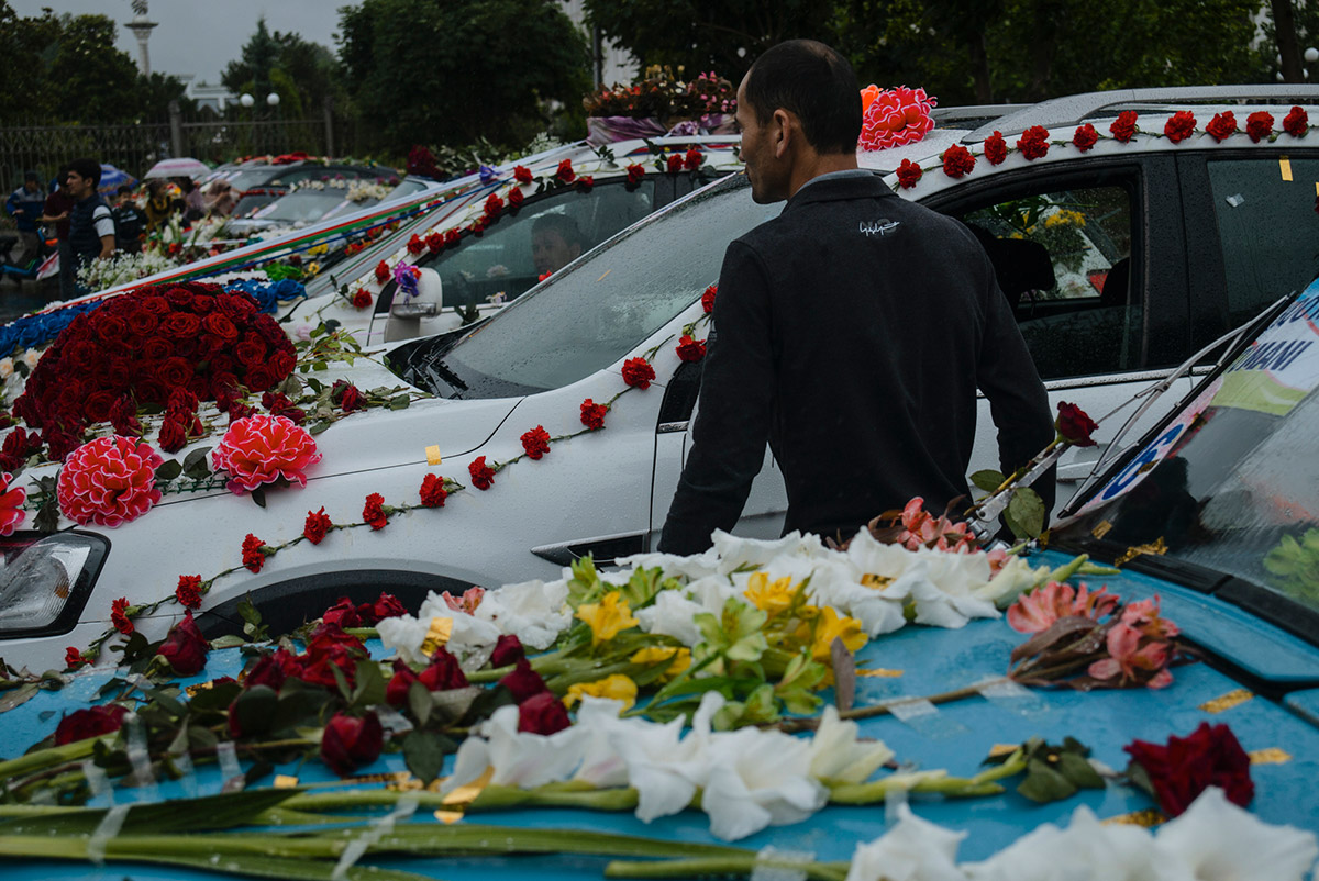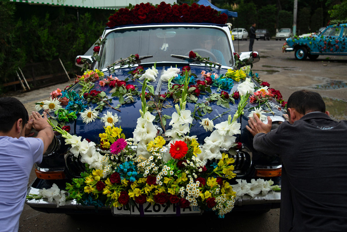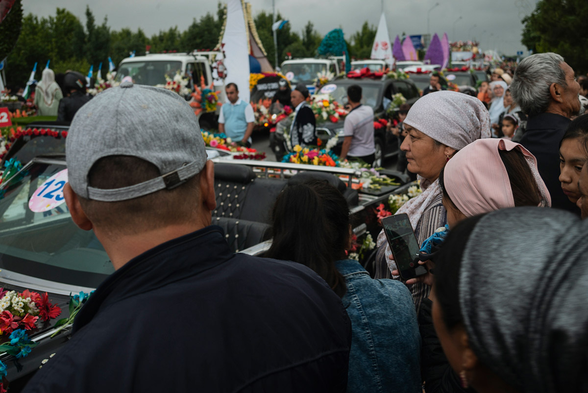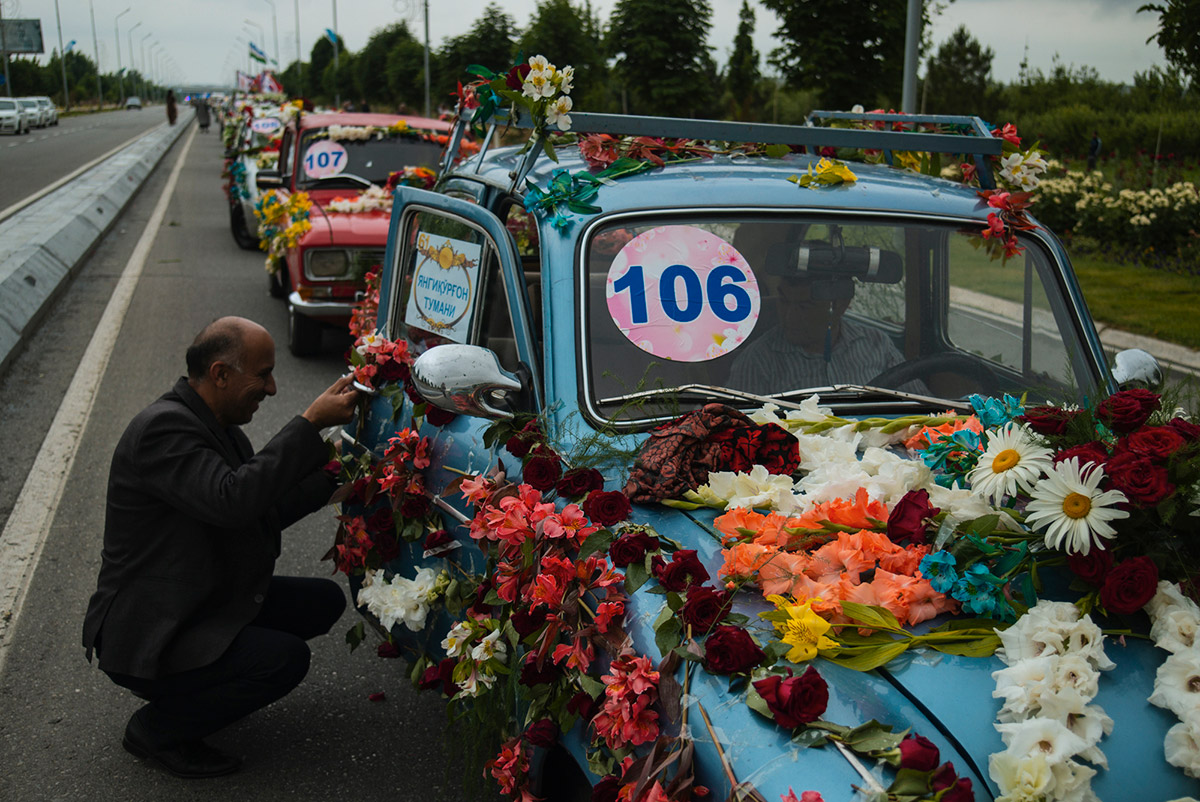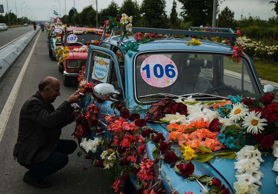 Вместе с ребятами мы добрались до точки сбора на подъезде к международному аэропорту «Наманган»: 200 украшенных автомобилей разного возраста и платформ разной степени креативности, а также разного соотношения живых и искусственных цветов в оформлении (все это легче показать на фотографии, чем описать словами).