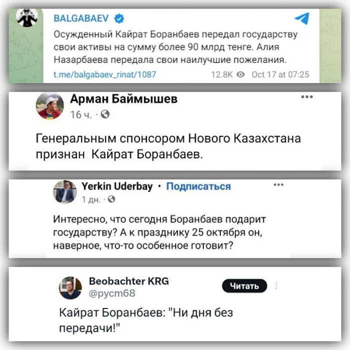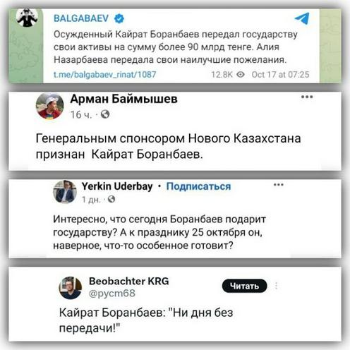 Возмещение средств вкупе со взносом в Фонд и переданными активами обошлось Боранбаеву почти в $300 млн. Это примерно половина его прежнего состояния. И это лишь то, о чем сообщили в Агентстве по финансовому мониторингу, но были и другие эпизоды «дарения».