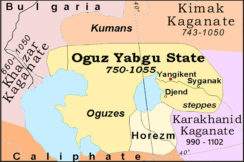 В нижнем течении Сырдарьи тем временем сложилось ядро огузского государства с центром в том самом Янгикенте — Новом городе. Есть основания полагать, что Приаралье в те давние времена было намного более увлажненным и зеленым местом, располагавшим благоприятными условиями для скотоводства — основы экономики огузов. По сути, их государство оставалось довольно-таки рыхлым по структуре кочевым объединением, а столица служила лишь временной (летней) ставкой верховного правителя ябгу, центром ремесел и торговли, в которой господствовали купцы из соседнего Хорезма. Впрочем, не Янгикентом единым, как утверждал географ XII века Мухаммад аль-Идриси: