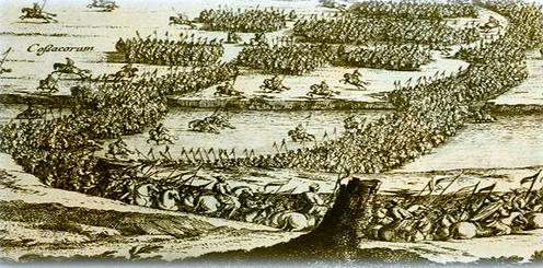 «Проводник доложил Тимуру, что на этой реке три брода... Но Тимур, светлый ум которого был центром лучей истины и здравомыслия, сказал, что переправляться по этим переправам не следует, потому что неприятель, может быть, устроил засаду, а что лучше нам двинуться к верховью реки и, возложив упование на бога, броситься в реку и переправиться [вплавь]. В тот же час откочевали и, отправившись к верховью реки, конные и пешие отовсюду устремились в реку и перебрались вплавь».