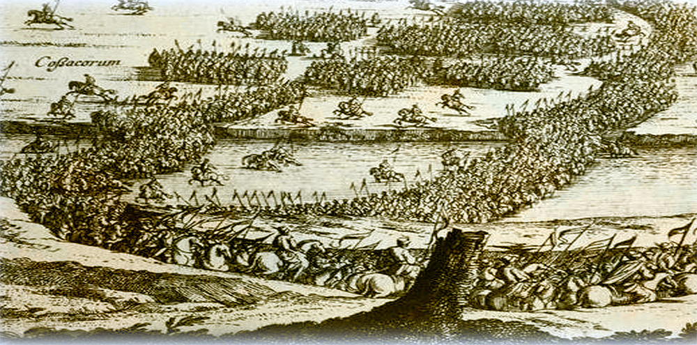«Проводник доложил Тимуру, что на этой реке три брода... Но Тимур, светлый ум которого был центром лучей истины и здравомыслия, сказал, что переправляться по этим переправам не следует, потому что неприятель, может быть, устроил засаду, а что лучше нам двинуться к верховью реки и, возложив упование на бога, броситься в реку и переправиться [вплавь]. В тот же час откочевали и, отправившись к верховью реки, конные и пешие отовсюду устремились в реку и перебрались вплавь».