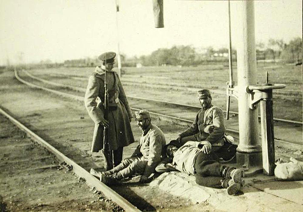 Русский солдат-конвоир около отдыхающих на железнодорожных путях пленных австро-венгерских солдат. Фото из открытых источников
