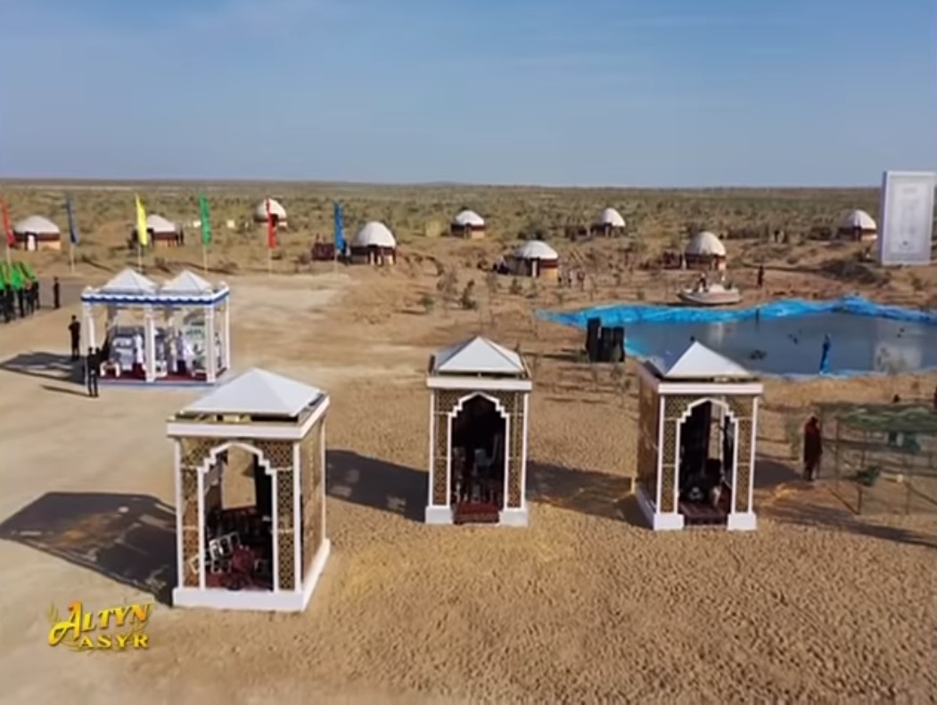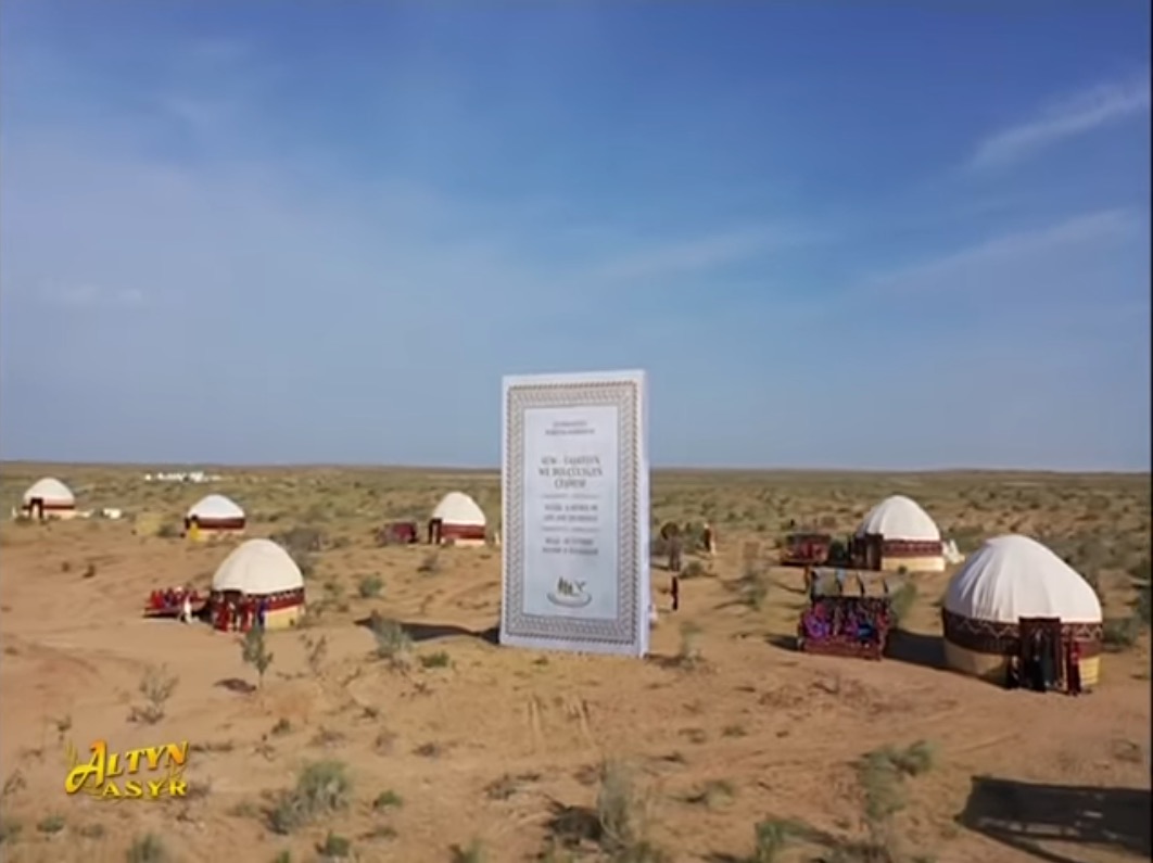 На ковровой дорожке Бердымухамедова приветствовали исполнители фольклорных сценок и театрализованных постановок на сюжеты из президентской двухтомной книги «Туркменистан – сердце Великого Шелкового пути» и произведения «Вода – источник жизни и изобилия». Среди картонных муляжей, украсивших пустыню, был муляж книги «Счастливая эпоха Аркадага», которая, как передают государственные СМИ, представляет собой «публицистическое повествование об огромной роли главы государства в осуществлении колоссальных преобразований во всех сферах жизни туркменского народа и общества».
