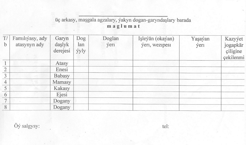 По словам источников «Хроники Туркменистана», с марта текущего года участковых обязали каждые два-три месяца собирать «уч арка» со всех граждан, проживающих на подконтрольной территории. Сотрудники спецслужб также обязаны каждые два-три месяца обновлять соответствующие списки. В справках указываются адреса живых родственников и места захоронения умерших.