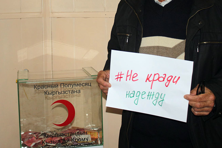 Флешмоб, в рамках которого неравнодушным гражданам предлагается выкладывать в соцсетях фотографии с плакатами #Не_кради_надежду, был объявлен из-за участившихся взломов благотворительных боксов в целом по Киргизии. По словам организаторов, они хотят донести до кыргызстанцев мысль о том, что деньги в таком ящике — шанс больных детей на выздоровление.