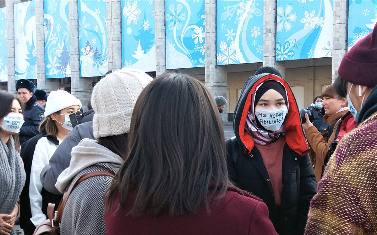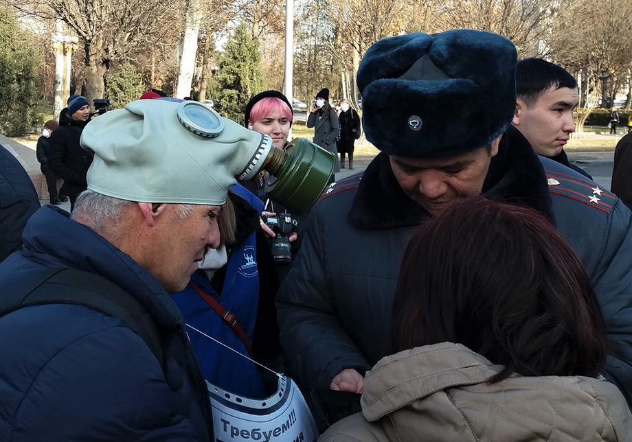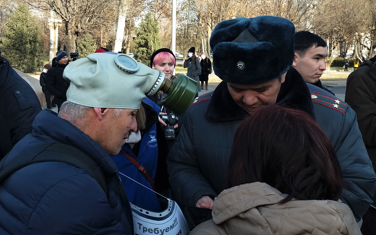 Милиционеры несколько раз пытались остановить акцию, указывая, что активист Аманкул Бабакулов (ранее организовавший антикитайский митинг) подавал уведомление о проведении митинга против смога и получил отказ. Но участники акции заявили, что Бабакулова среди них нет и он не имеет к ним отношения.