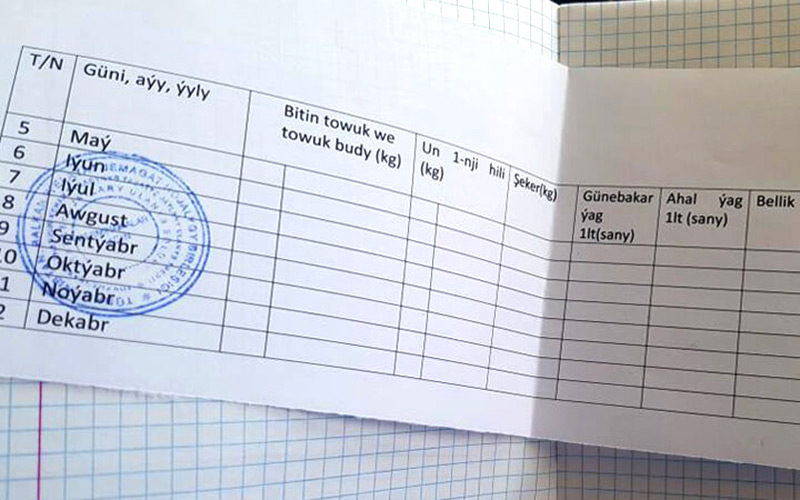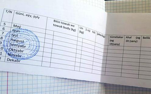 В мае карточную систему ввели в областном центре Балканабаде. Теперь эта схема действует и в Туркменбаши — крупном портовом городе, расположенном рядом с престижной курортной зоной Аваза. «Карточки» представляют собой тетради, в которые степлером прикрепляется справка из домоуправления о составе семьи. В тетрадь записывают, какое количество того или иного продукта семья приобрела за текущий месяц. Нормы отпуска минимальны — по килограмму и менее.