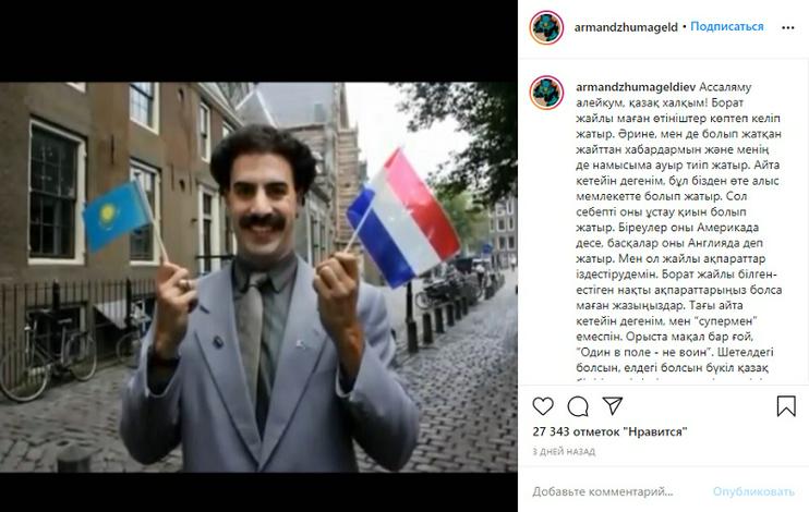 Арман Джумагельдиев, известный в криминальных кругах как Арман Дикий, призвал казахов наказать британского комика Сашу Барона Коэна за фильм «Борат», который, по его мнению, высмеивает Казахстан. Об этом он написал в своем Instagram.