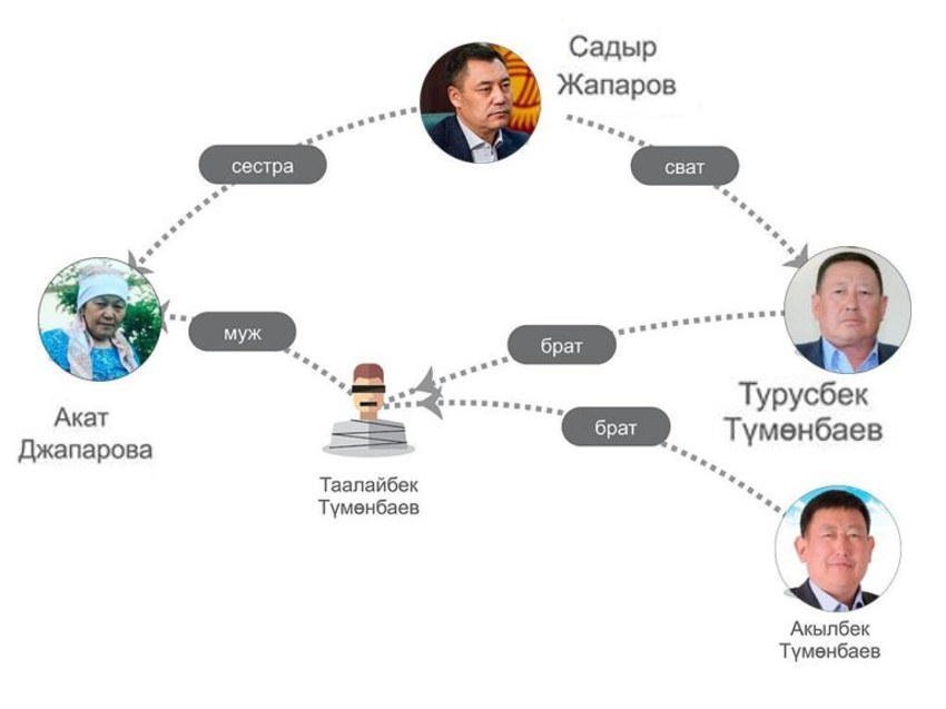 С той поры в социальных сетях Киргизии часто писали, что Тумонбаев приходится родственником мужа одной из сестер Садыра Жапарова.