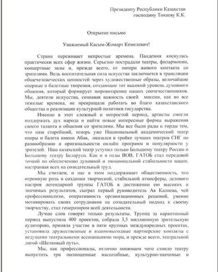 Обращение к президенту, среди прочих, подписали народные артисты оперы и эстрады Казахстана Бибигуль Тулегенова, Ренат Салаватов, Гафиз Есимов, Нагима Ескалиева, Лаки Кесоглу, Нуржамал Усенбаева, Люция Тулешева.