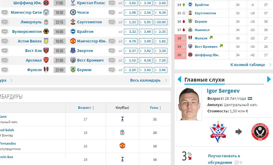 Аналитики немецкого сайта Transfermarkt оценили вероятность перехода нападающего сборной Узбекистана и казахстанского «Актобе» Игоря Сергеева в клуб английской Премьер-лиги «Шеффилд Юнайтед» в 3%.