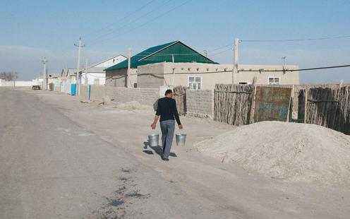 Житель приаральского Муйнака - бывшего аральского морского порта - несет питьевую воду, проведенную сюда западными донорскими организациями.. Фото Тимура Карпова/Фергана