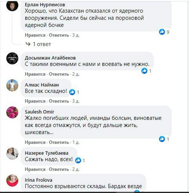 «Что угодно, но опять никто из Минобороны не виноват. Максимум получат выговоры либо перевод на другую работу, должность. Арысь, Тараз... Люди, проживающие в районах войнских частей/складов, берегите себя».