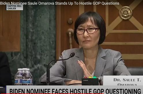 Сенатор от Луизианы Джон Кеннеди спросил Омарову, родившуюся в 1966 году, покинула ли она официально Коммунистический союз молодежи. Как предположила Омарова, автор вопроса имел в виду Всесоюзный Ленинский коммунистический союз молодежи — комсомол.