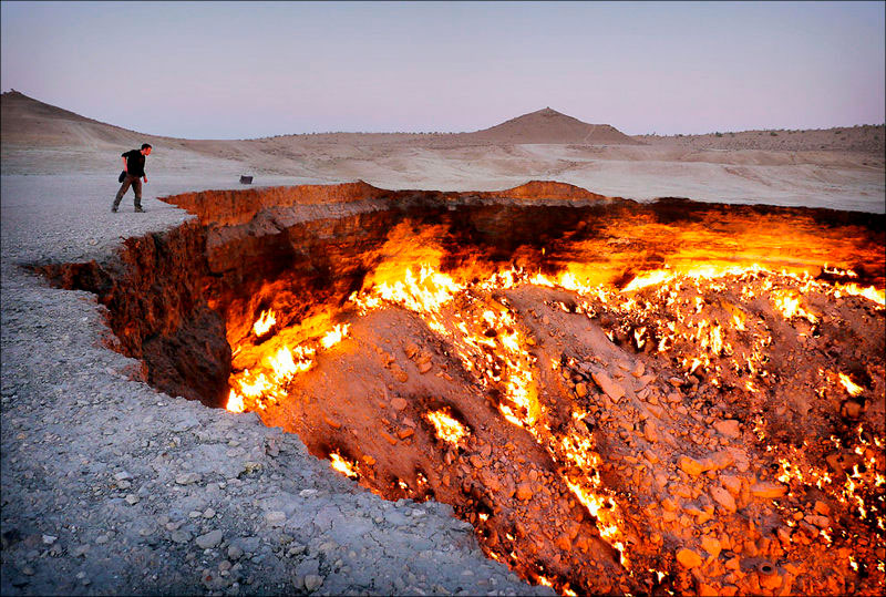 Кратер появился в 1971 году на месте скопления природного газа, которое обнаружили советские геологи. Пробурив скважину, они вызвали обвал – верхние слои почвы обвалились в подземную пещеру, открыв большую дыру, наполненную газом. Геологи решили поджечь газ, полагая, что со временем огонь погаснет. Но кратер горит до сих пор. Его диаметр составляет 60 метров, глубина – около 20 метров. Столбы пламени могут достигать 15 метров в высоту.