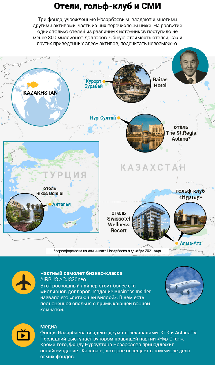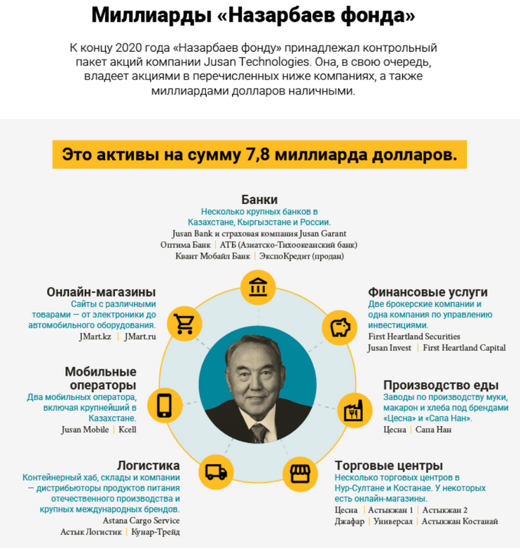 «Часть активов перешла под контроль назарбаевских фондов (некоторые по-прежнему находятся в совместном владении) от олигархов, которые обязаны своим состоянием клановому капитализму, сложившемуся во время его правления. Некоторые из частных компаний, впоследствии приобретенные фондами, получали финансирование от правительства Казахстана. Сейчас фонды Назарбаева контролируют больше предприятий, чем многие международные конгломераты», — отмечают авторы расследования.