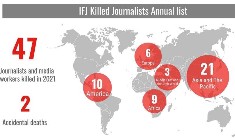 Всего в мире в прошлом году погибли 47 журналистов, в том числе 7 женщин — они стали жертвами целенаправленных нападений, перестрелок и взрывов. Еще двое погибли случайно. Количество погибших работников медиа уменьшилось по сравнению с 2020 годом, когда было зарегистрировано 65 фактов убийств журналистов.