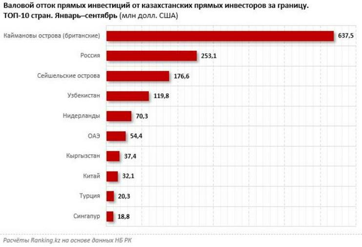 Более половины от общей суммы выведенного капитала ($814,1 млн) казахстанские инвесторы направили в офшоры. Так, наибольший объем вложений за 9 месяцев прошлого года пришелся на Каймановы острова — $637,5 млн, что почти втрое превышает объем выведенных туда средств за аналогичный период 2020 года. В другую офшорную зону — Сейшельские острова — были выведены $176,6 млн.