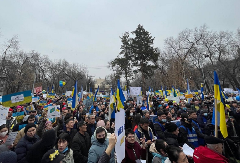 Около 2 тыс. человек участвовали в митинге в поддержку Украины, который прошел 6 марта в Алматы, передает КазТАГ. Акция состоялась за кинотеатром «Сары-Арка». Ее участники держали в руках флаги Украины, голубые и желтые шары, плакаты с призывами к миру. Также они пели песни на украинском языке.