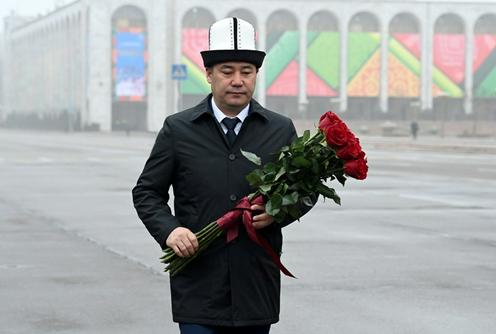 Садыр Жапаров возлагает цветы к монументу памяти погибших во время Аксыйских событий 2002 года и апрельских событий 2010 года на площади Ала-Тоо в Бишкеке. Фото с сайта President.kg