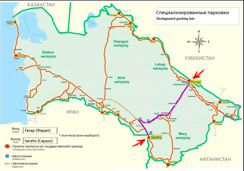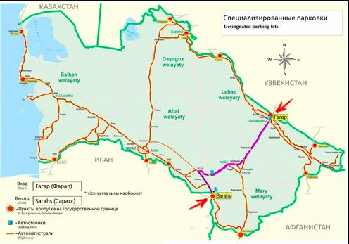 Въезд грузов на туркменскую территорию разрешен через контрольно-пропускные пункты «Фарап» — «Алат» (Узбекистан) и «Серахс» — «Серахс» (Иран).