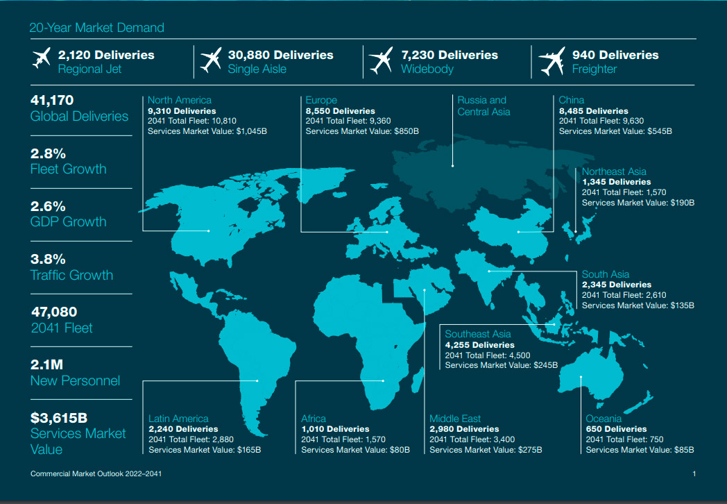 Ожидается, что к 2041 году мировой парк самолетов увеличится на 80% по сравнению с допандемическим уровнем 2019 года.