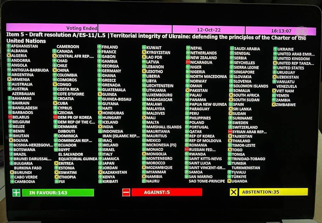 За резолюцию голосовали 143 страны, против — 5, воздержались 35 стран.