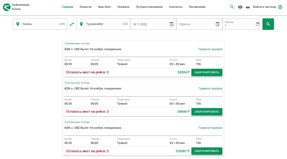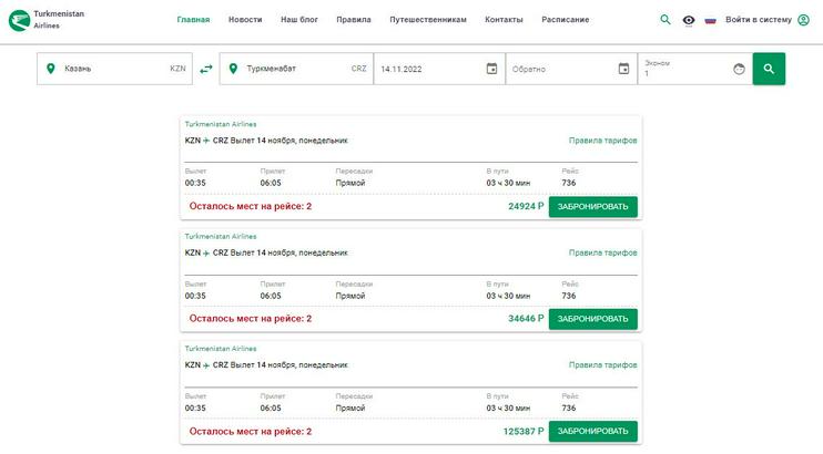 Так, 18 октября билеты эконом класса на 14 ноября из Казани в Туркменабат по тарифу A30/TM (только для продажи на территории РФ для граждан Туркменистана) можно купить на сайте за 24,9 тысяч рублей ($403). Билеты эконом класса на тот же рейс по тарифу H30D/wekillk (для граждан РФ и других стран только на территории России) продаются по 34,6 тысяч рублей ($560).