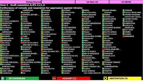 Четыре страны Центральной Азии — Узбекистан, Казахстан, Кыргызстан и Таджикистан — воздержались при голосовании по проекту резолюции о репарациях России для Украины в ходе заседания 11-й чрезвычайной сессии Генеральной ассамблеи ООН, которое прошло 14 ноября.