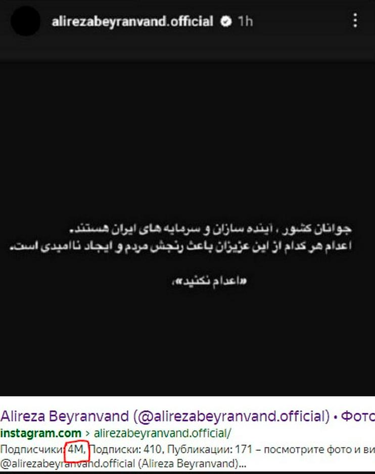 «Молодежь страны – будущие строители и капитал Ирана. Казнь каждого из них вызывает у их близких возмущение и отчаяние. Нет казням!», — написал Бейранванд в Instagram 10 декабря.
