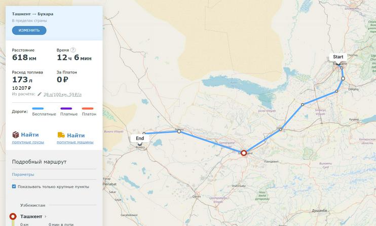 Что вы увидите, нажав на кнопку «Рассчитать маршрут»? По центру страницы появится карта, на которой цветными линиями будет обозначен путь. Линии могут быть голубыми, красными или фиолетовыми, в зависимости от наличия платных дорог. Маршрут Ташкент — Бухара полностью голубой, значит, все дороги бесплатные.