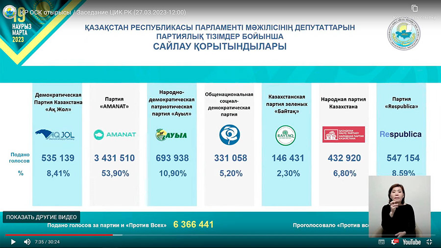 👉 Демократическая партия «Ак жол» — 8,41% (535,1 тысячи голосов) и шесть мест;