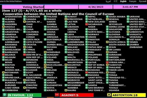 Представители 122 стран мира, включая Казахстан, Китай, Армению и Турцию, проголосовали за принятие резолюции ООН о «Сотрудничестве между Организацией Объединенных Наций и Советом Европы». Против проголосовали представители пяти стран, в том числе РФ и Белоруссии.