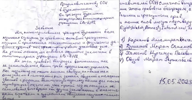 Четверо туркменских политзаключенных написали письмо в представительство ООН в Туркменистане с просьбой защитить их от правового беспредела. Об этом сообщает Turkmen.News со ссылкой на журналиста Алламырата Рахимова, показавшего полученное им послание из колонии в программе на своем YouTube-канале.